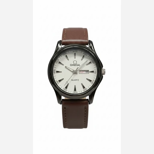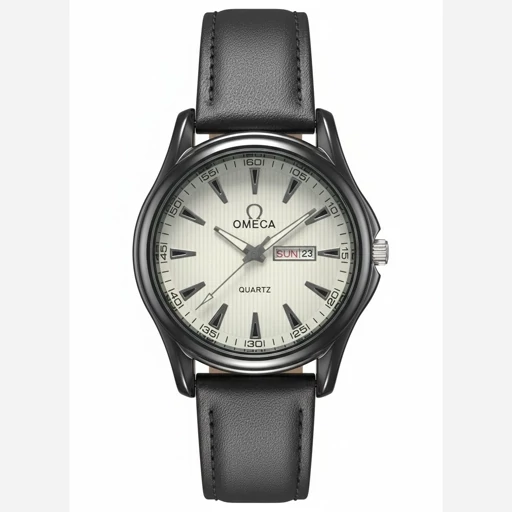 OMEGA امگا مردونه کلاسیک دارای نمایشگر روز و ماه دو تقویم قفل سگکی بندچرمی صفحه خاص و متفاوت شش ماه ضمانت همراه جعبه وباتری اضافی