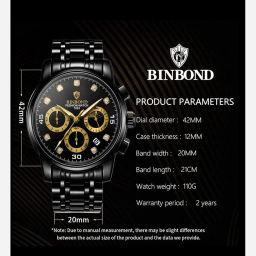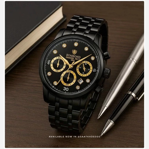 Binbond For Men برای آقایان موتور شرکتی A++ 3 موتور فعال کرنوگراف دارای روزشمار بند استیل قفل استیل کلیپسی شیشه کریستال ضدخش ضدآب 3Atm همراه جعبه وباتری اضافی