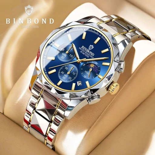 بین باند مدلی نو ☑️یک اثر اصل و منحصر بفرد مقاوم دربرابر آب🏊♂💦 قاب الماسی کرنوگراف نمایش مون استار نشانگر ماه وخورشید دارای روز شمار بند استیل شیشه سافایر شب نما درخشان ونمایشی قفل مخفی موتور اورجینال پک دار همراه جعبه وباتری اضافه