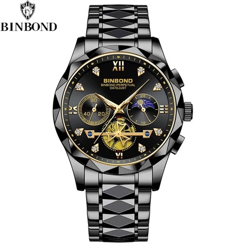 BIN BOND ساعت مچی مردانه اورجینال بین باند موتور اورجینال چهارموتور فعال کرنوگراف رنگ ثابت ضد اب کارت گارانتی یک سال ضمانت نمایشگر خورشید وماه نمایش 24ساعت ضداب 3atm قفل استیل پروانه ای مخفی رنگ بندی کامل مناسب استایل فشن اسپرت کلاسیک