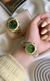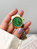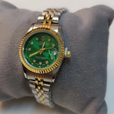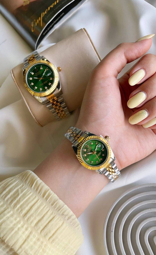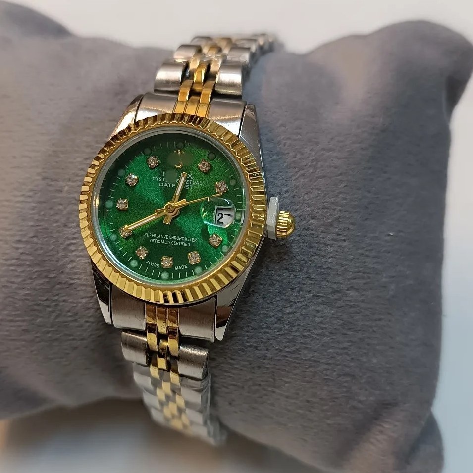 ساعت مچی زنانه رولکس رنگ سبز شیک و خاص پسند بند استیل نقره ای طلایی ضد آب رنگ ثابت دارای تقویم روز شمار قفل کلیپسی به همراه جعبه و باتری اضافی