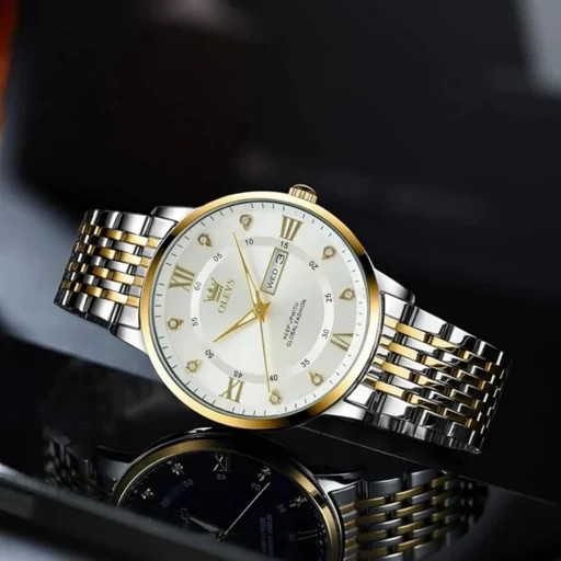 olevs 🔥Sold well Couple watch الوز طراحی بی رقیب 《ویژگی های محصول 》 مقاوم در برابر آب طرح الماس دارای روز شمار ایام هفته صفحه شب نما بند وستاری قفل پروانه ای استیل مخفی شیشه سافایر ضدخش همراه جعبه وباتری اضافی
