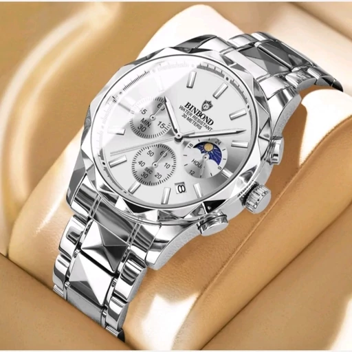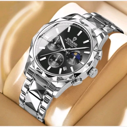یک اثر اصل و منحصر بفرد مقاوم دربرابر آب🏊♂💦 قاب الماسی کرنوگراف نمایش مون استار دارای روز شمار نمایش خورشید وماه بند استیل شیشه سافایر شب نما درخشان ونمایشی قفل کلیپسی موتور کوارتز