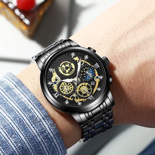 ⌚️بین باند مدلی نو •مدل HX4010 اسکلتون صفحه نمایش چرخ دنده ای بند استیل دارای روز شمار قفل کلیپسی موتور کوارتز همراه جعبه چوبی مقدار: 1 عددی